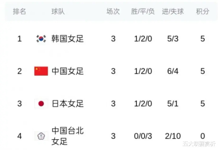 东亚杯第三轮比赛,随着韩国队2-0击败中国台北女足,中国女足0-0战平日本队,最终的积分排名尘埃落定:韩国队“奇迹般”以第一名的身份夺得冠军,中国女足则反超日本队,升到第二名,获得亚军;而日本队最差,只获第三名。
