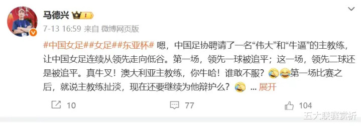 马德兴在点评米利西奇时,毫不掩饰的炮轰道:“他让中国女足连续从领先走向低谷。”